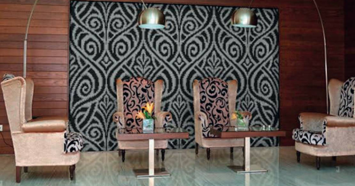 A háttérfalra komponált ornamentikus mozaikminta fekete, szürke és fehér árnyalataival tökéletesen illeszkedik a bútorzat textúrájához és színvilágához. Olyan hatást kelt, mintha egy modern freskó elevenedne meg – csak épp nem ecsettel, hanem ezernyi precízen illesztett üvegmozaik darabbal.
