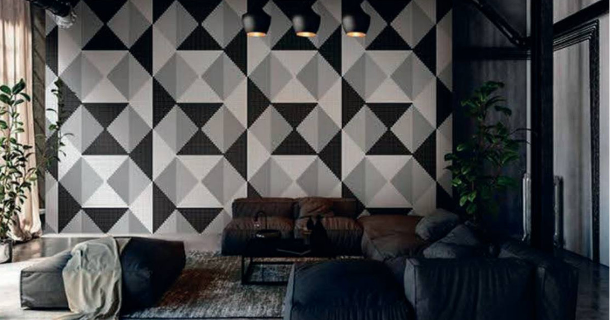 A monokróm – fehér, szürke és fekete – árnyalatokból álló geometrikus mintázat egyfajta vizuális ritmust kölcsönöz a térnek. A háromszög-alapú mintázatból összeálló burkolat nemcsak szemet gyönyörködtető, hanem optikai hatásokat is kelt, így mélységet és mozgást visz az egyébként puritán falak közé. A pixel art technika pedig lehetővé teszi, hogy ez a minta apró, fényes üvegmozaik szemcsékből épüljön fel – így a fény minden napszakban más és más arcát mutatja a felületen.
